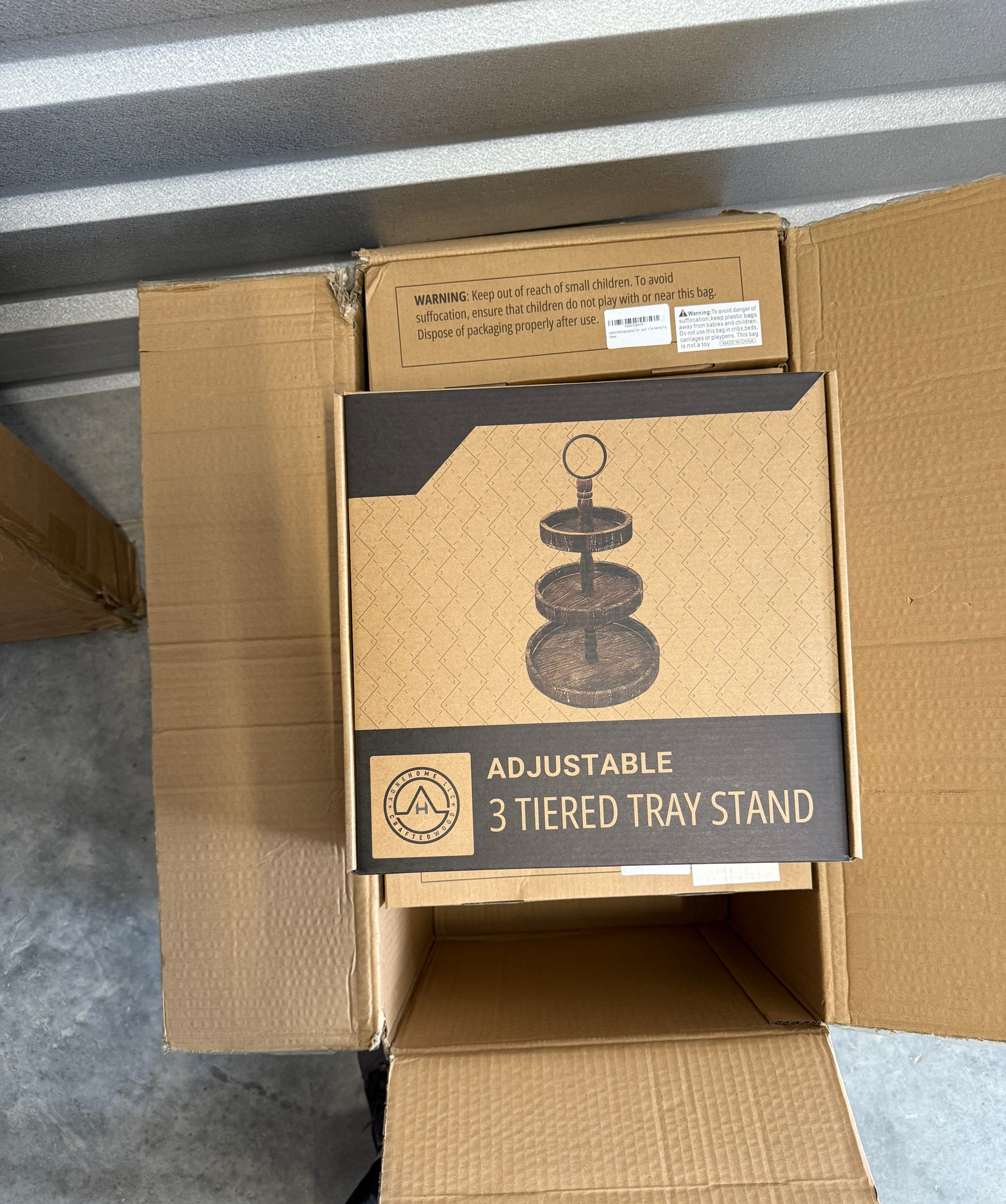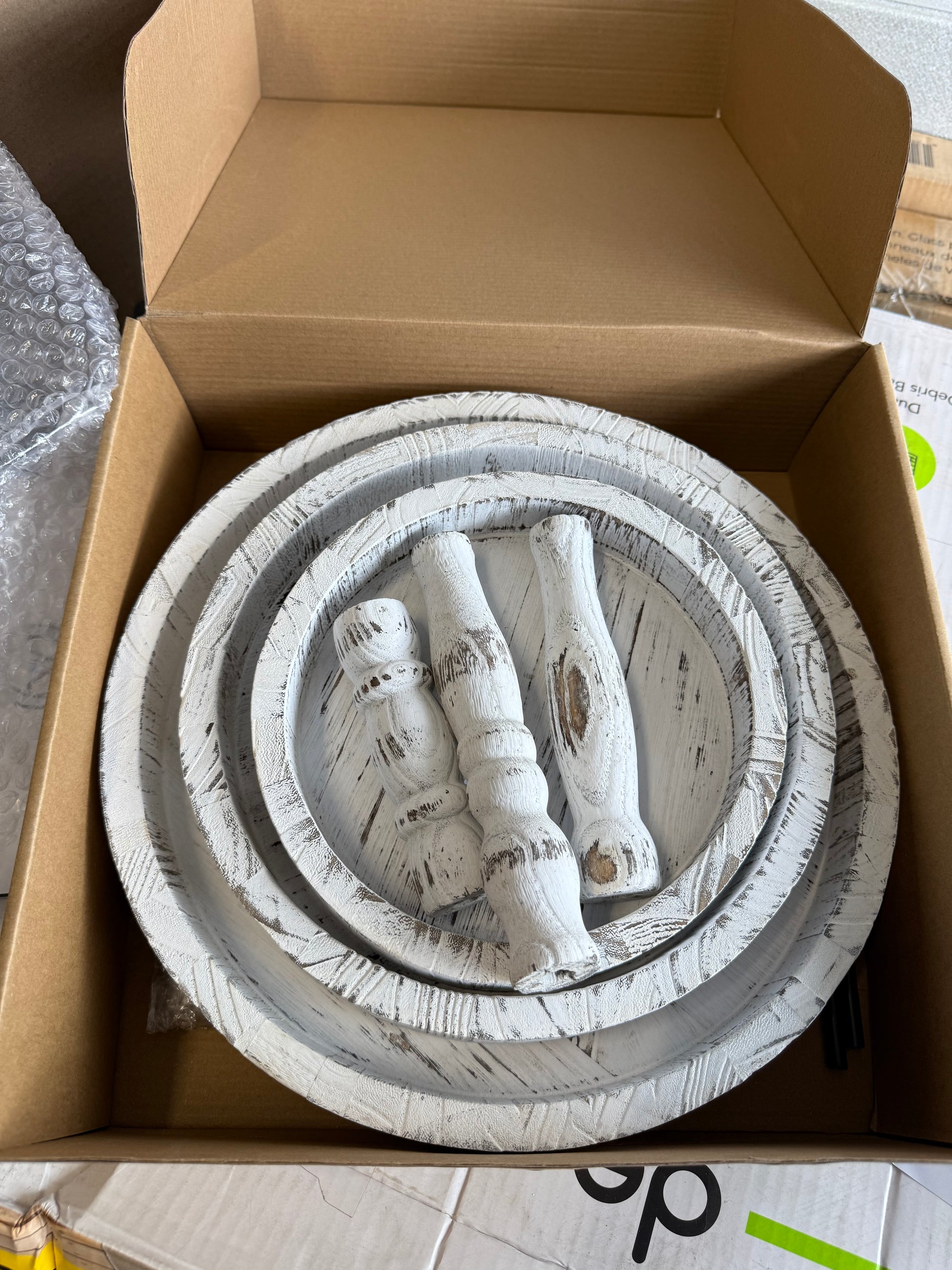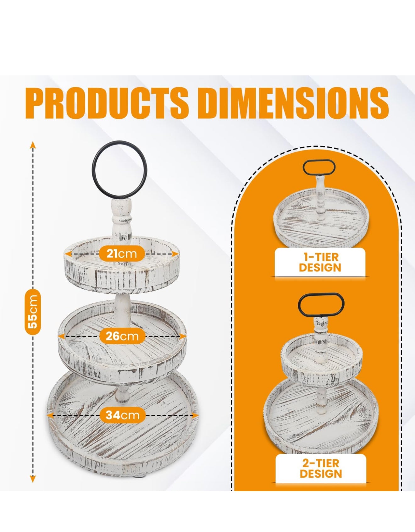 Add charm and functionality to your home with this 3-tiered tray in distressed white wood. Perfect for both everyday use and special occasions, this versatile stand provides ample space for displaying and organizing items in style. Whether you use it as a dessert stand, fruit display, coffee station organizer, or decorative centerpiece, it brings a cozy farmhouse feel to any space.