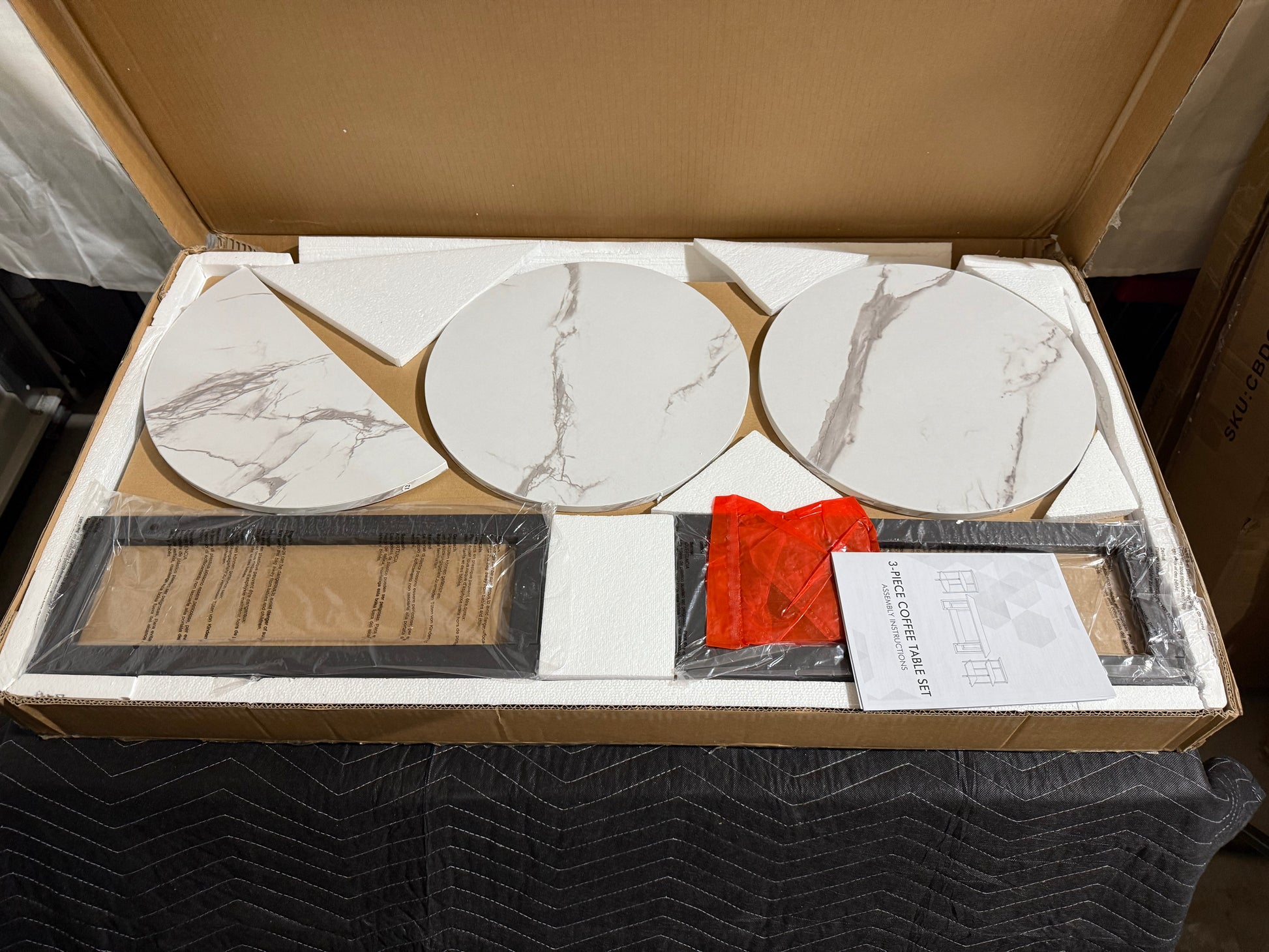 Elevate your living room with this stylish 3-piece table set featuring a sleek white faux-marble finish and sturdy black metal frame. The set includes one rectangular coffee table and two versatile end tables, perfect for adding both function and modern charm to your space.